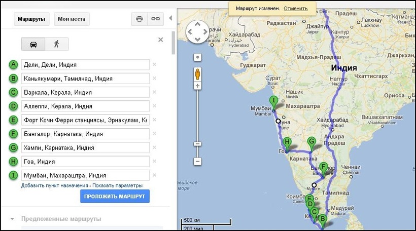 Дели, Агра, Каджуарахо, Орчху, Джалгаон, Эллора (пещеры), Форт Даутладабад, Ахмаднагар, на поезд экспресс в Гоа (Маргао). Достаточно удобно по советам бывалых. Получаете очень даже много мест. По городам смотрите рядом достопримечательности. Агра - Тадж-Махал, например. На фото другой маршрут (похожий), побольше, но тоже из Дели.