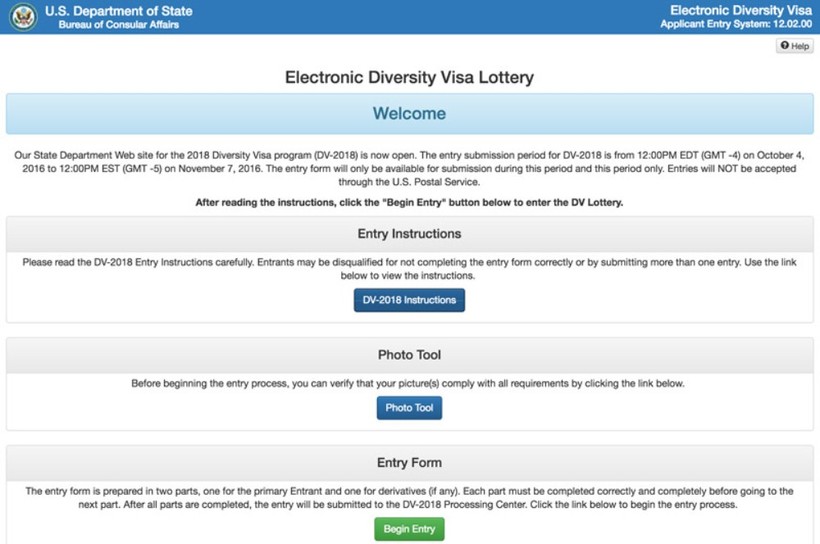 Для начала переходим на официальный сайт, где мы увидим три кнопочки: "DV Instructions" (инструкции по заполнению анкеты), "Photo Tool" (сервис для подготовки фото) и "Begin Entry" (сама анкета).