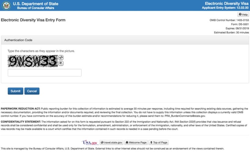 После этого приступаем к заполнению анкеты (кнопочка “Begin Entry”). Вводим проверочный код.