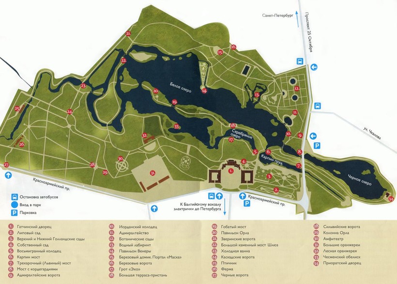 По-моему, самый интересный объект в Гатчине — Дворцовый парк. Прямо рядом с ним, в 200-х метрах, расположена станция «Гатчина-Балтийская». Поэтому, в Петербурге, на Балтийском вокзале, покупайте билеты на электричку именно до нее. Не перепутайте! До Гатчины идут 2 железнодорожные ветки. «Гатчина-Варшавская» очень удалена от парка и, соответственно, менее удобная. Цена билета в 2017 г. — 102 руб. (ехать 1 час). А автомобилистов могут подстерегать пробки. В лучшем случае, доедете за один час, а то и за два. Обоснование «электричного» маршрута: