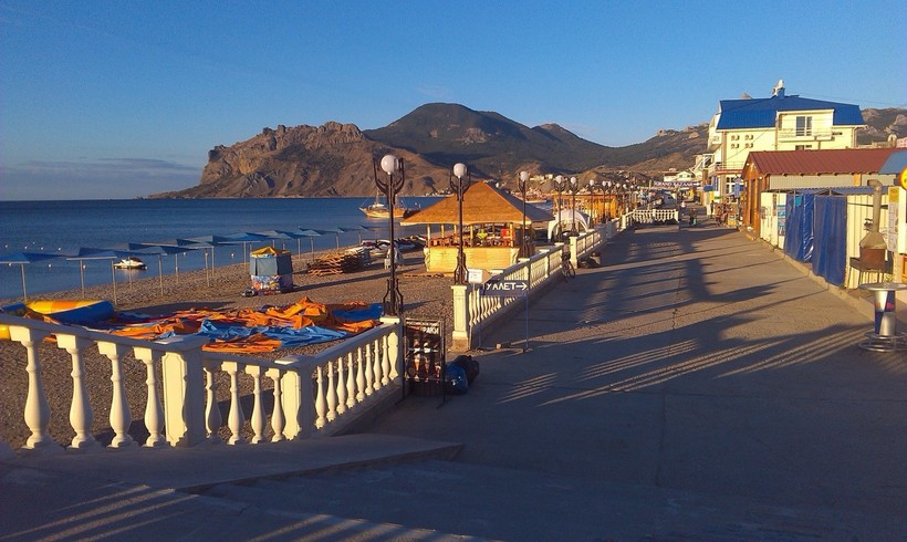 Не подумайте, курортное местечко по приезде, конечно, меня встретило теплом, но я сейчас не говорю о купально-пляжном сезоне. В поселке настоящая осенняя погода. Единственное, она тут теплая и сухая. Осадков, например, за недельный отпуск я не застала. Да и похолодания обошли меня стороной. Температура в полдень была стабильна и поднималась до отметки +16 градусов. Плюс все дни оказались погожими. Ни тучки, ни облачка... В море, повторюсь, я не купалась, но воздухом морским дышала ежедневно. Непривычно, конечно, наблюдать за пустынными пляжными зонами. Что касается вечера, то уже после 16:00 температура опускалась. В воздухе ощущалась свежесть и прохлада. Ночью на курорте +12. Я, честно признаюсь, готовилась к худшему. Даже шапку и перчатки взяла. Продолжительность светового дня в Коктебеле 11 часов.
