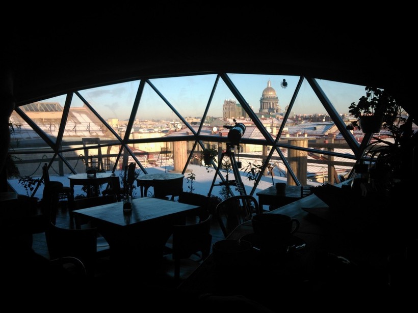 Для меня город открывается по-новому в зависимости от ракурса, поэтому предлагаю всем отправится на крышу Solaris lab. Лучше всего сюда приходить вечером, когда, сидя под стеклянной крышей, можно созерцать умопомрачительный вид на ночной Питер. Вдвойне приятно наслаждаться таким видом с вкусными напитками и в удобном кресле.