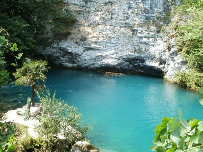 Озеро Юпшарского каньона. Что бы добраться до него, нужно идти по серпантину, но дорога не будет утомительной, так как вокруг открываются прекрасные виды нетронутой абхазской природы. Озеро имеет красивый голубой цвет.