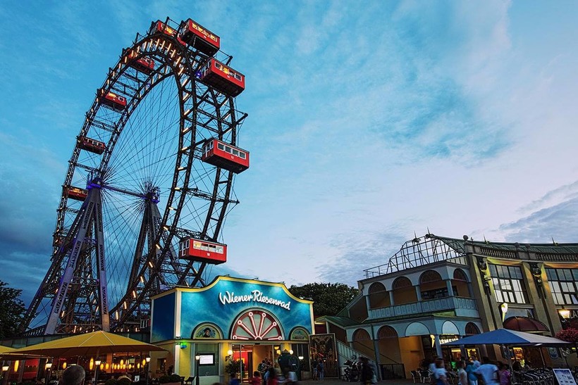Большой парк с развлекательными аттракционами находится достаточно далеко от центра. Именно здесь находится знаменитое старинное колесо обозрения Вены и высокая башня Пратер с цепями, на которой тоже можно увидеть город с высоты птичьего полета. Лучшие аттракционы:
