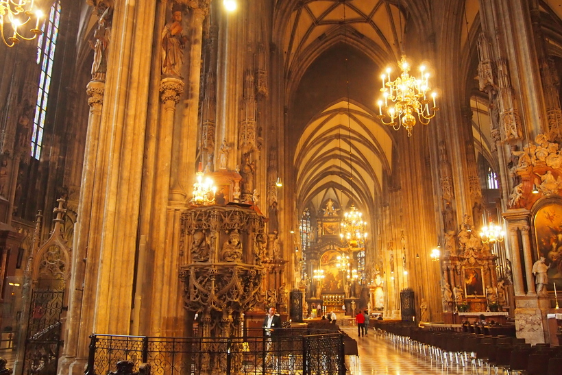 Посмотрите Собор Святого Стефана на Stephansplatz, 3. Можно взять экскурсию по катакомбам под зданием. В соборе проводятся службы, и при желании можно на них попасть. Вообще очень колоритное и атмосферное место.