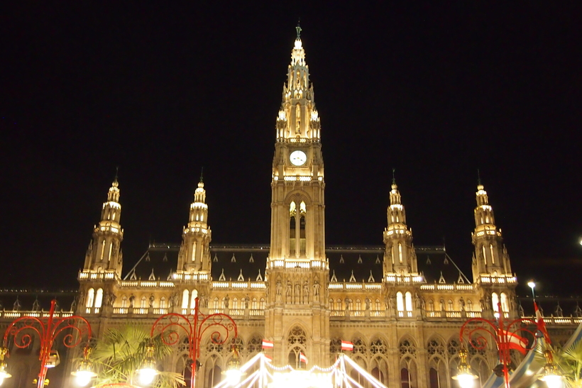 Это очень красивое здание я увидела впервые уже во время вечерней прогулке по Вене. Подсвеченное множеством огней, оно было невероятно. Ратуша находится в центре города, поэтому около нее часто устраивают ярмарки, гуляния, а в день моего приезда под ее окнами стоял шатер цирка шапито. Мимы, клоуны на ходулях, глинтвейн и свежая выпечка, счастливые и беспечные лица горожан – классическая картина европейского праздника. Днем, вернувшись к ратуше, можно рассмотреть ее в другом свете. Это статное неоготическое сооружение, уже не первую сотню лет служащее для заседаний и решений важных вопросов.