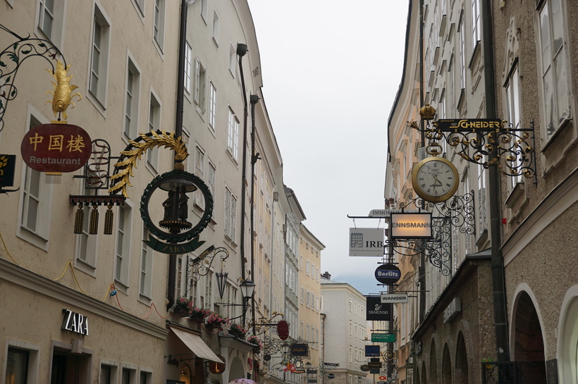Пожалуй, самая диковинная достопримечательность Зальцбурга. На ней я нашла все: магазины одежды, кафе, рестораны, сувенирные лавки, заведение, продающее новогодние игрушки, сделанные из яичной скорлупы и многое другое. Но примечательна она другим — оформлением. Любая вывеска или реклама на этой улице обязана вписываться в архитектурный стиль города. Поэтому даже вывеска сети быстрого питания, будет выглядеть так, будто пришла к нам из Средневековья.