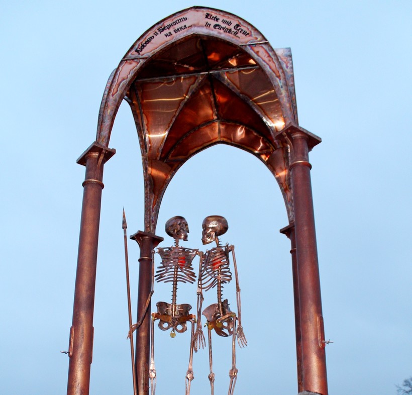 Чтобы увидеть памятник настоящей любви вам придется немного прокатиться. Находится он в поселке Орловка. Не знаю, правда, ходит ли туда общественный транспорт, я была на машине. Под аркой на каменном постаменте стоят два горячо влюбленных скелета. Девушка грустно свесила руки вниз, юноша держит копье и преданно смотрит на возлюбленную. Любовь до гроба привлекает не только таких циников, как я, но и молодоженов. На ребрах скелетов болтается не один замок.