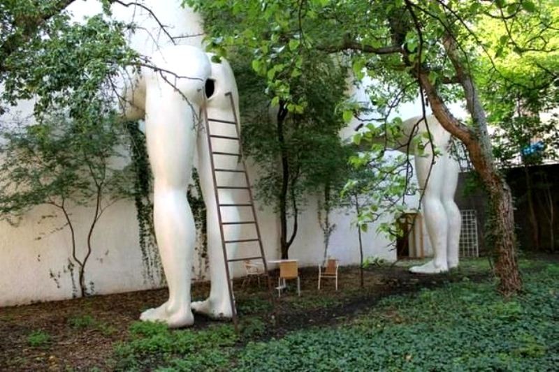 - «Висящий человек» - очень правдоподобная скульптура, представляющая из себя висящего на крыше дома на одной руке Зигмунда Фрейда (а снизу он вылитый Ильич, честное слово!)
