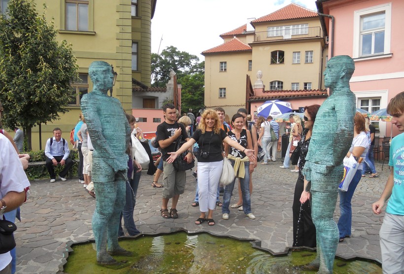 В самый первый приезд нас познакомили с поражающей воображение абсурдной скульптурой художника Давида Черного "Писающие мужчины". Это фонтан, где железные мужчины справляют малую нужду на карту Чехии, причем весьма реалистично. Если отправить смс-команду, то струями на водной глади они напишут ваше пожелание. Несмотря на некоторую пикантность и критику, скульптура стала широко известна как еще одна достопримечательность Праги. Возле нее всегда многолюдно и весело. В фонтан бросают деньги,чтобы опять вернуться. А рядом, кстати, музей Кафки, если кому-то хочется чего-то высокого.