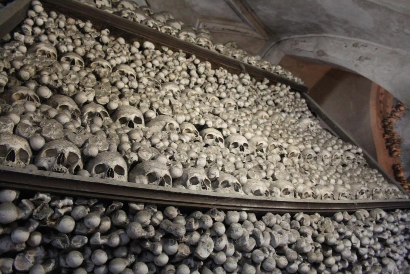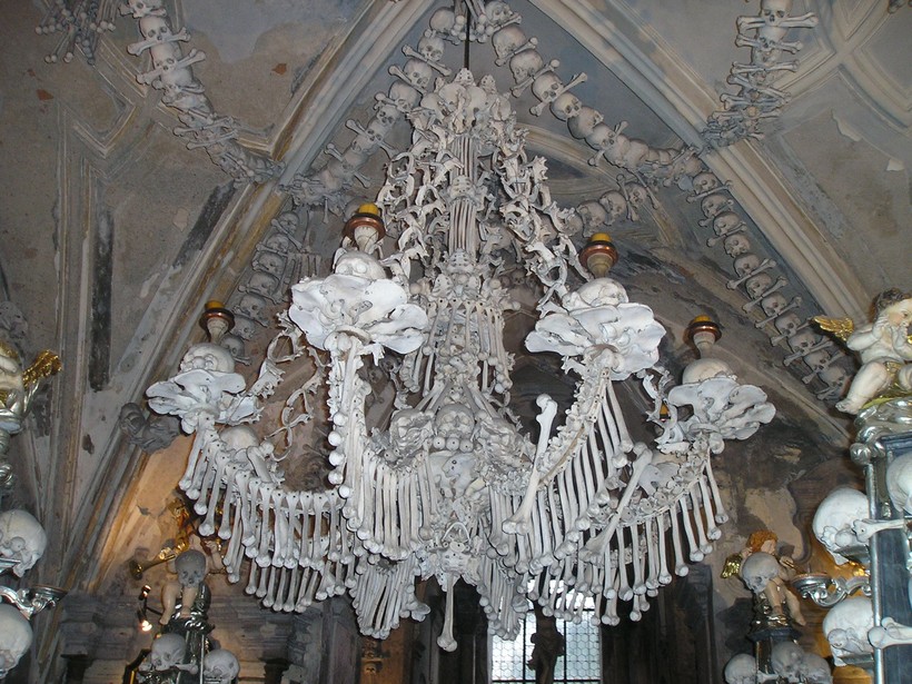 На часовню костела Всех Святых было потрачено более 40 тысяч костей. Настоящих костей. Человеческих. Жуть. Даже огромная люстра сделана из косточек. Брр. Везде висят черепа. Местами свисают скелеты. Даже не верится, что кому-то пришло в голову это всё соорудить. Уж больно необычные материалы для убранства.