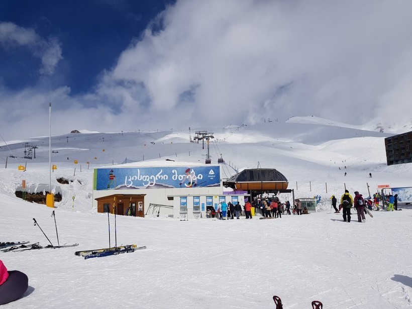 Отдыхая в Казбеги, загляните на ближайший горнолыжный курорт Гудаури. Снежное покрытие в марте хорошее. Не забудьте намазаться солнцезащитным кремом, у меня лицо после дня катания напоминало спелый помидор.