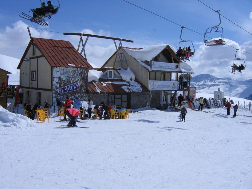 Трассы здесь от зеленого до черного уровня. Я каталась пару раз в Подмосковье, поэтому ограничилась трассой для начинающих. Муж с друзьями ходили на красные и синие направления. В феврале аренда оборудования на день примерно 700 руб. На ски-пасс один день 40 лари. Это 1000 рублей. Любители тюбинга поднимаются бесплатно. Детский билет - 1 день - 25 лари. Билет действует от 6 до 16 лет. Я больше сидела на террасе с чашкой кофе и грелась на солнышке, чем каталась.