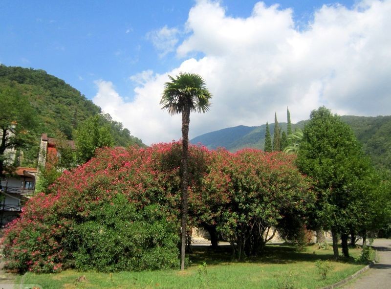 Разумеется, купаться прохладно. Воздух не прогревался днем больше 23 градусов, а вода подавно, максимум, градусов 15 была. Ножки несколько раз удалось намочить, не более. Зато развалиться на пляже в купальнике под ярким солнцем удавалось ежедневно. Солнечные ванны не прошли даром — домой уезжала шоколадкой. :) Весна в Гагре сопровождалась буйным цветением всего вокруг, аромат вокруг стоял шикарный, аж голова кружилась!