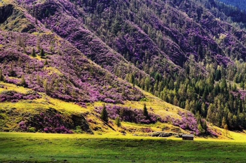 Понравилась особенность алтайских гор в мае — растительность по склонам расположена как-то особенно, в зависимости от времени суток общий цвет высокогорья может меняться от сиреневого до ярко зеленого.