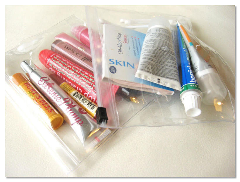 общий объем жидкостей до 1 литра (крем, блеск, зубная паста, тушь и шампунь считаются тоже жидкостями);