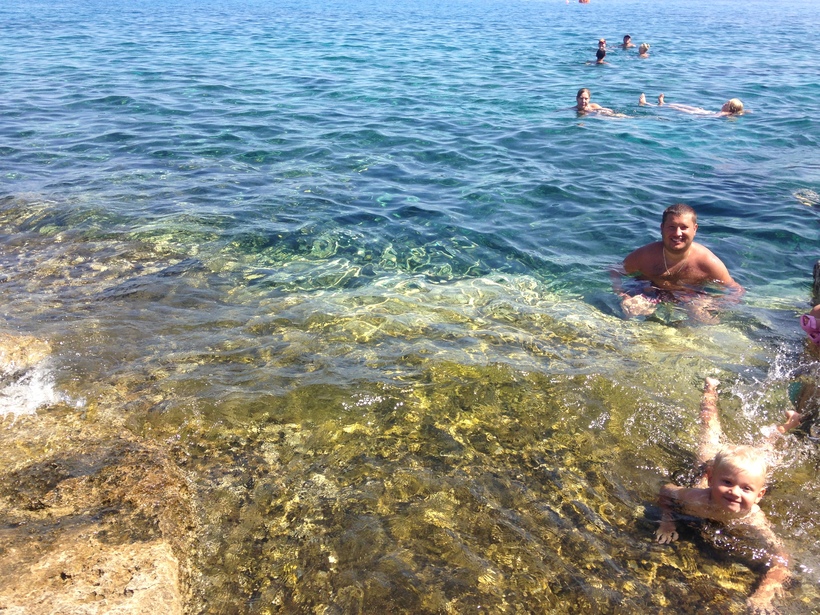 Сразу же по прилету мы побросали вещи и - прямиком на море. Чтобы понять, какое море на Кипре, нужно в него окунуться! Оно божественно: чистое (видно пальчики ног), соленое (соль выталкивает тело на поверхность), прозрачное и ласково-теплое!