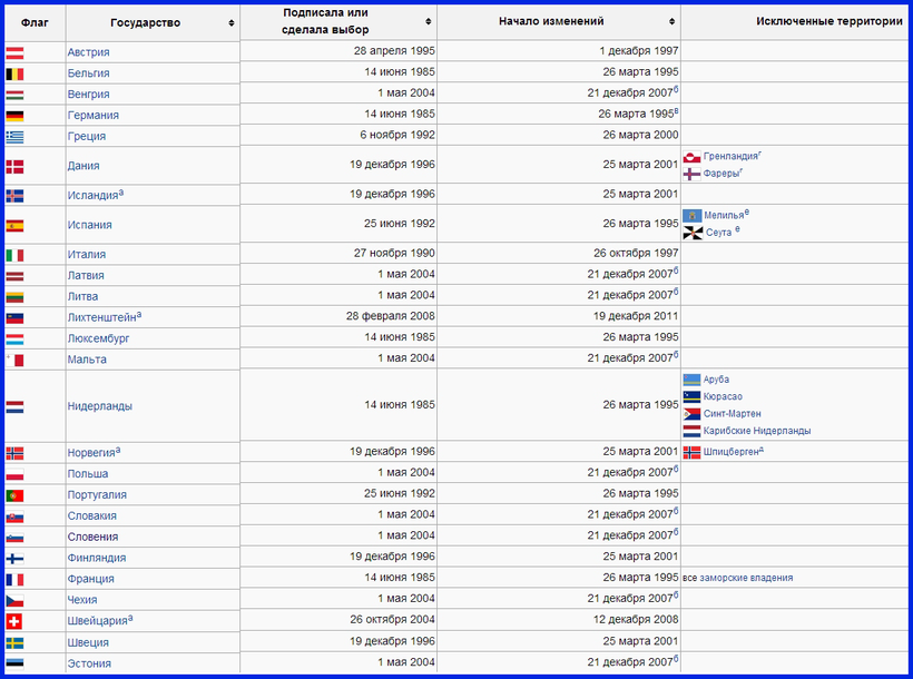 Предлагаю просмотреть таблицу, где указан список государств и год подписания ими Шенгенского соглашения.