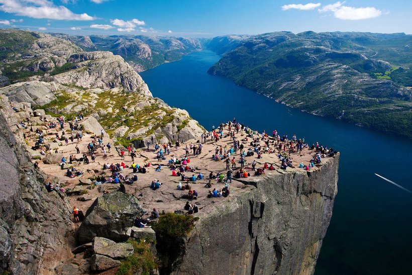 - Прекестулен в Норвегии. Тут мне было страшно – мне кажется, что можно какие то бортики сделать или забор, я постоянно боялась, что на меня нападет какой-нибудь человек и скинет с этого знаменитого утеса, ну могу я иногда так побояться, знает –ли.