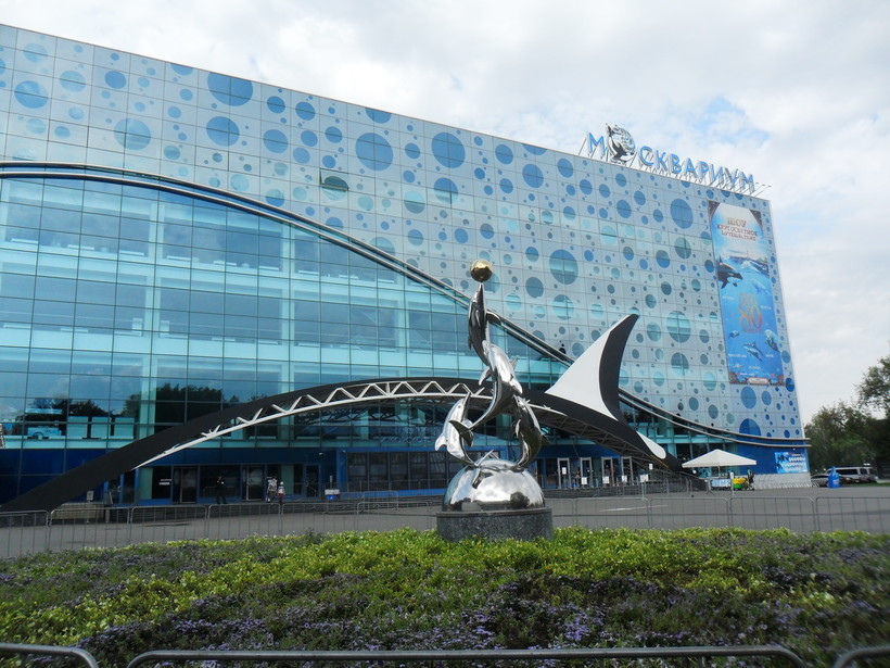На ВДНХ находится и знаменитый Москвариум, с красивой скульптурой дельфинов перед ним.