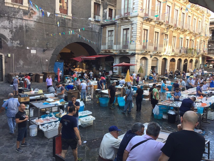 Сердце Катании – рыбный рынок, расположенный на побережье. Яркие краски, необычные запахи, громкие крики торговцев создают особую атмосферу. В майском путешествии я сделала еще одно открытие – крохотная улица dei Crociferi застроена невероятным количеством зданий.
