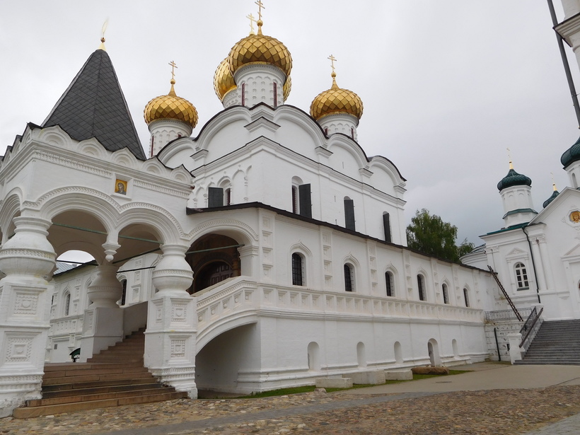 Ипатьевский монастырь расположился на берегу реки Кострома. На его территории за толстыми белеными стенами надежно спрятались от глаз архитектурные шедевры: