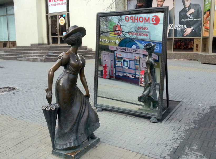 - А вот другая скульптура — «Модница перед зеркалом». Зеркало — самое настоящее. Модница — тоже. А вот клепающие одинаковые селфи туристы чем-то подозрительно похожи друг на друга…