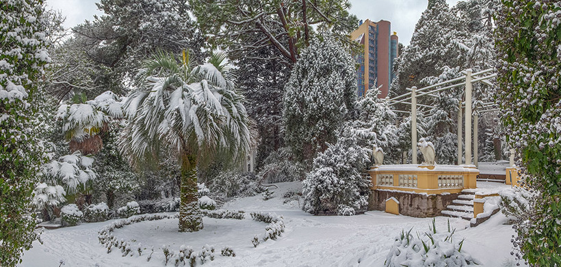 Дендрарий в снегу. Здесь собрана коллекция растений со всего мира. Снег в Адлере бывает очень редко, но иногда все же выпадает и сразу же тает.Набережная в Адлере. Здесь очень приятно прогуляться в тихую погоду. К тому же можно поесть вкуснейших чебуреков.