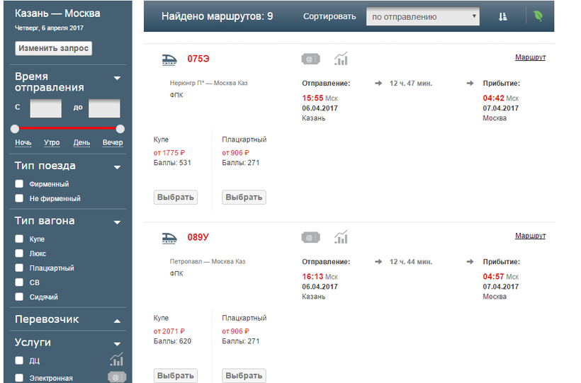 - Выбираем один из поездов, которые ездят по маршруту в этот день.