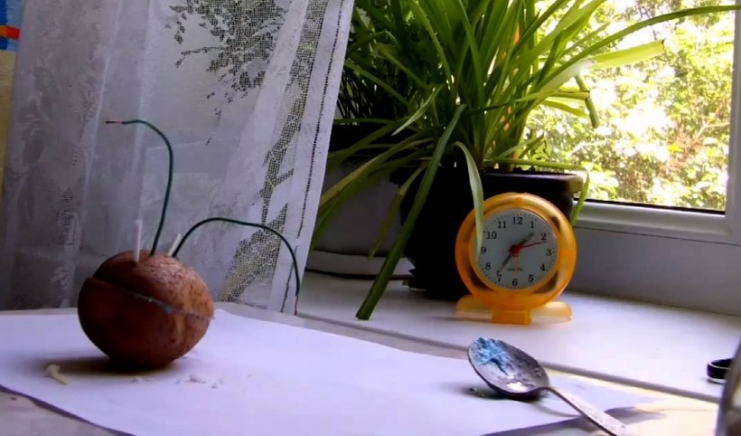 Как видно, проблема может возникнуть с проводами, но их легко заменить, например, скрепками. Картошку надо разрезать пополам, а в одной из половинок ложкой сделать углубление размером с саму ложечку. Теперь нужно сделать «электролит» — смешать соль и зубную пасту, а затем поместить смесь в ямку. Теперь нужно пропустить проводки через вторую половинку окунуть их в пасту, а затем скрепить картошку, проткнув ее зубочистками.