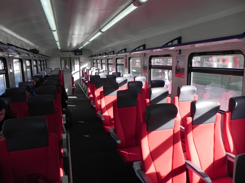 При посадке вы попадете в комфортный и чистый салон поезда, где есть при в входе в вагон багажные отсеки, куда можно положить чемодан. Сидения удобные, мягкие, их можно откинуть и поспать в дороге, соседи сидят на приличном расстоянии, поэтому никак не помешают во время пути. Есть вагоны бизнес класса, которые еще более комфортные, но и стоят дороже.