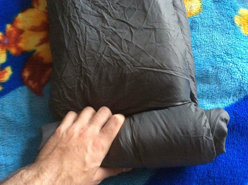 - Теперь начинаем аккуратно сворачивать спальник. Делать это следует так, чтобы разравнивать при складывании складки, их не должно быть.