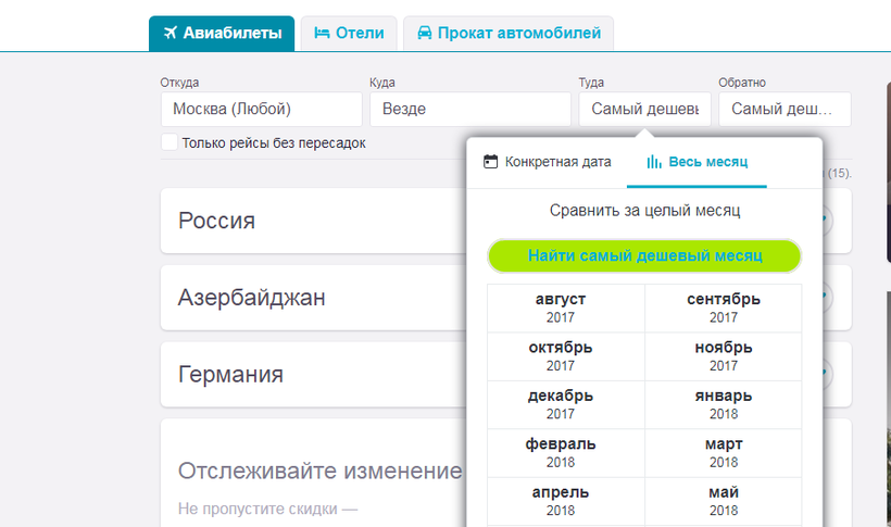 Итак, знакомый уже skyskanner имеет отличную кнопку: искать везде. Нажав ее и введя аэропорт вылета, вы увидите подборку стран, в которые вы можете улететь. Список составлен в порядке возрастания цен на билеты. Нажав при этом кнопку «найти самый дешевый месяц», получите огромный выбор дат и городов, и благодаря ему, сможете планировать свои ближайшие поездки и накопления на последующие.
