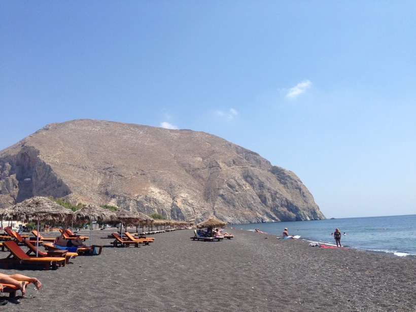 Температура Эгейского моря — 24 градуса. Ласковые волны приятно охлаждают тело после принятия солнечных ванн. Загар ложиться более мягче, чем в разгар жаркого лета, когда кожа буквально сгорает. Но я всё равно пользовалась солнцезащитными средствами на всякий пожарный. На Санторини находятся живописные пляжи, известные во всём мире. Советую посетить следующие: