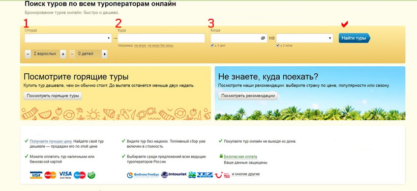 В этом случае к поездке можно подготовиться заранее. Выбрать желаемую дату и выбрать город отправления. Так как же нам это сделать? Конечно, ничего сложного и в этом случае нет. Выбираем сайт для поиска тура, их много. Далее фильтруем по желаемому направлению, по дате и смотрим по цене. Выбрали? Отлично! Оплачиваем онлайн и получаем все документы в электронном виде на почту.