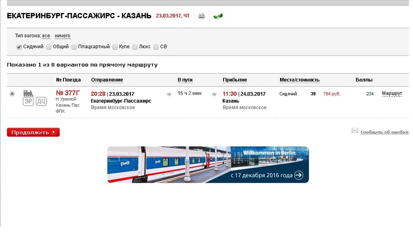 Пример дешевого билета. Екатеринбург-Казань. Сидячий вагон, 15 часов и 780 рублей.