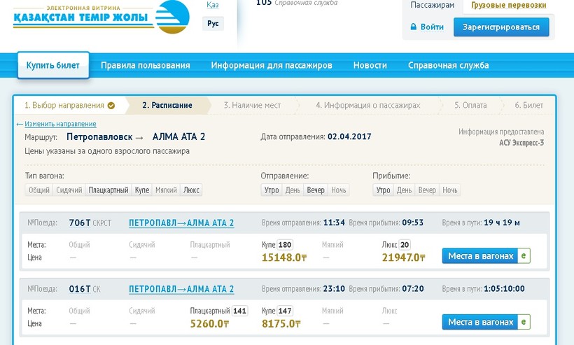 Например, обычный поезд из Петропавловска в Алматы. Плацкарт стоит 5200 тенге, это около 1000 рублей.
