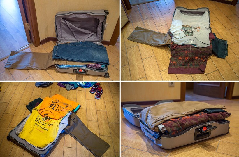 Вещи типа свитеров катайте в валики, так сэкономите место в "чумайдане". Из носков тоже делайте рулетики и запихивайте в обувь - опять же экономия пространства. Обувь не кладите парами, только вразнобой. Брюки и джинсы кладите на самое дно, даже можно не складывать - в конце штанинами накроете верхний слой.
