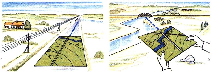 - ориентирование по линиям местности (дороги, реки);