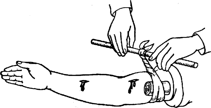 Как правило, а таких случаях накладывается жгут выше раны. Медицинский жгут можно заменить резиновым или обычным бинтом, тесьмой, резиновыми трубками. Важно наложить его с силой, достаточной для остановки кровотечения, но не допустить при этом посинения кожи и повреждения тканей. Зимой жгут можно оставлять на 1 час, летом на 1,5, после чего в случае надобности через каждые 40 минут жгут ослабляется на 3-4 минуты, кровоточащий сосуд на время зажимается пальцами. После наложения жгута накладывается давящая повязка.