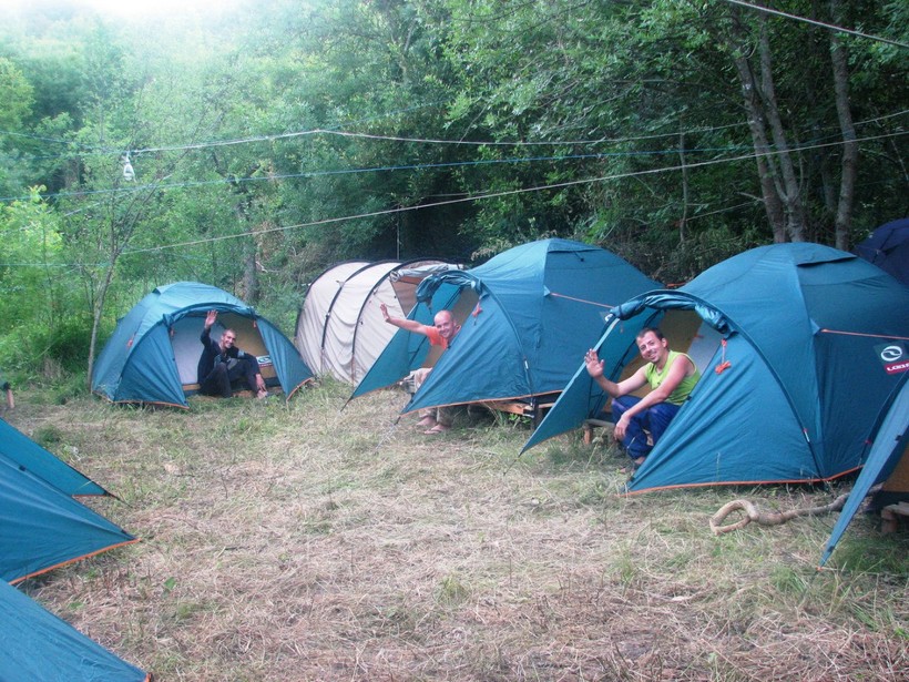 Безусловно, самое главное — это позитивный настрой. Для меня это был первый ночлег в палатке. Всю ночь мне чудился скрежет ножа по палатке (насмотрелась фильмов ужасов), я не сомкнула глаз, караулила наш покой:). Но это только в первый день, дальше спалось замечательно:). Разбили мы наш палаточный «городок» на берегу реки, там, кстати, есть платные зоны с туалетом (не био), где можно разместиться. Помимо нас на этом месте уже были палатки таких же дикарей, как и мы. Еду готовили на мангале или в котелке, самым популярным блюдом был шашлык и уха:).