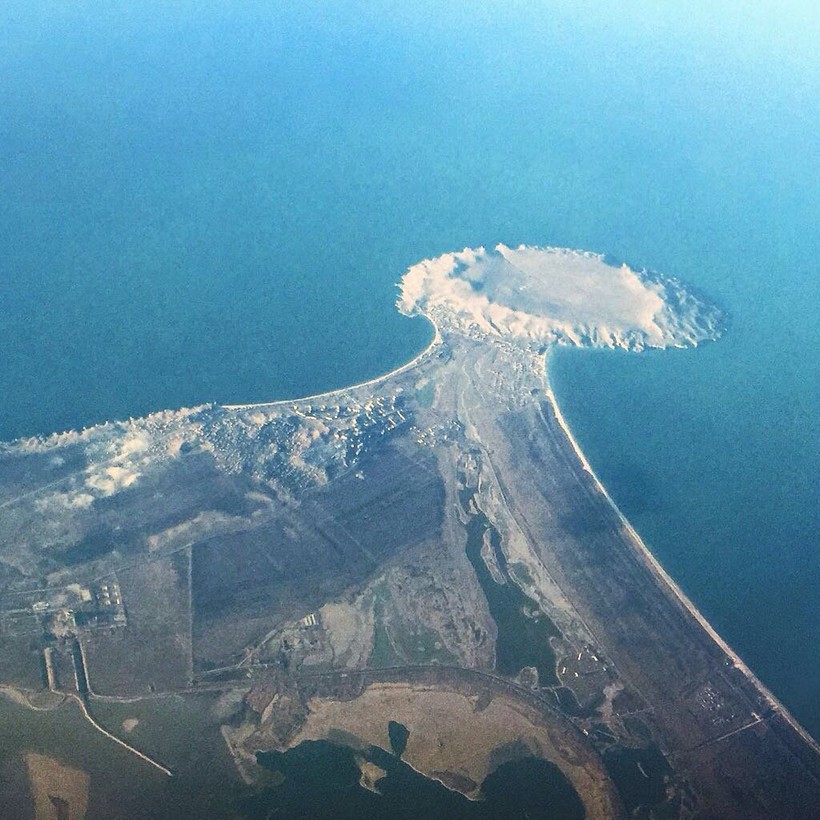 Мыс Казантип имеет вид казана. Интересно, что самая низкая его точка – 20 метров над уровнем моря, а самая высокая – 106. Он практически круглый, от того и название — казан. Мне трудно представить, как древние люди могли определить его формы и ощутить себя внутри так, как в казане. Ну ладно, хорошо, округлость можно понять, обогнув его на лодке. Но как прочувствовать казан? Мне, с моим извечным женским топографическим кретинизмом, кажется это невероятным. Ведь диаметр казана почти четыре километра. То ли дело нынешние технологии позволяют всё рассмотреть. Пролетая над родными краями, трудно сдержать себя и не сделать фотку. Особенно в хорошую погоду. Муж моей сестры сдерживаться не стал точно.