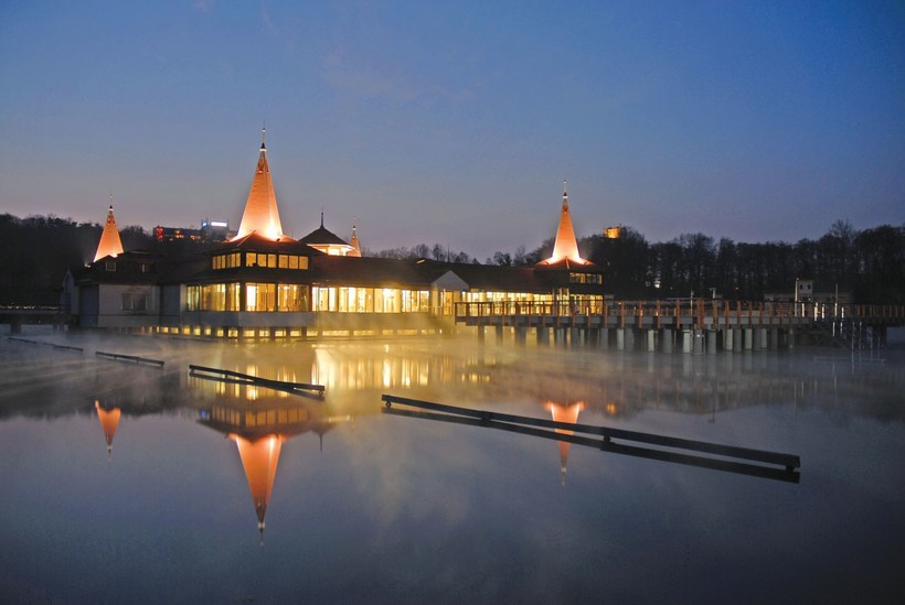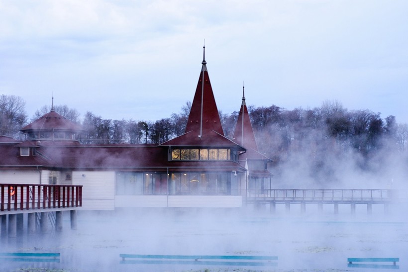В марте 2019 года я отдыхала в венгерском городе Хевиз (Heviz). Здесь расположено одноименное известное термальное озеро, в котором можно купаться в любое время года. Его питают 2 термальных и 1 минеральный источник. Круглогодичная температура воды термальных источников равна +38 и +48 градусов, а минерального: +17. Из-за этого в мартовско-апрельский период озерная вода очень теплая: +25…+30. Она обновляется каждые 48 часов.