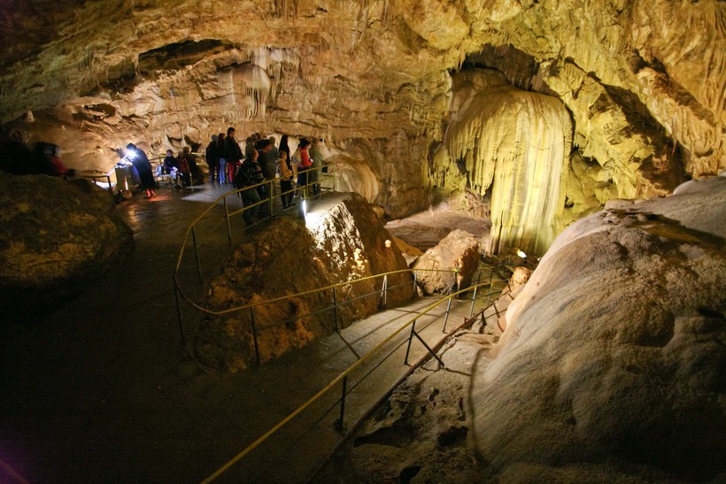 За спиной захлопываются символические ворота, и возникает чувство, будто ты муравей на ладони великана. Экскурсионная тропа идёт по металлическому мостику на сваях, и необъятные своды пещеры окружают тебя как сверху, так и снизу. Разноцветные сталактиты («Череп», «Падишах», «Стоунхендж»), теряющийся в полумраке потолок, неподвижное карстовое озеро, которое никогда не увидит солнца…