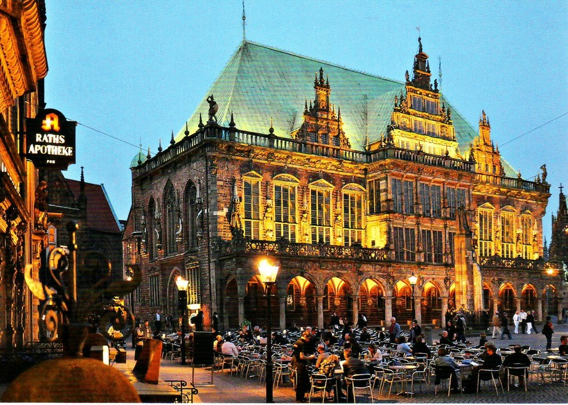 - Бременская ратуша, построенная еще в 1410 году, пережила войну и сохранилась до сих пор. Рядом с ней можно посмотреть знаменитую статую Роланда, Бременский собор и знаменитую скульптуру музыкантов.