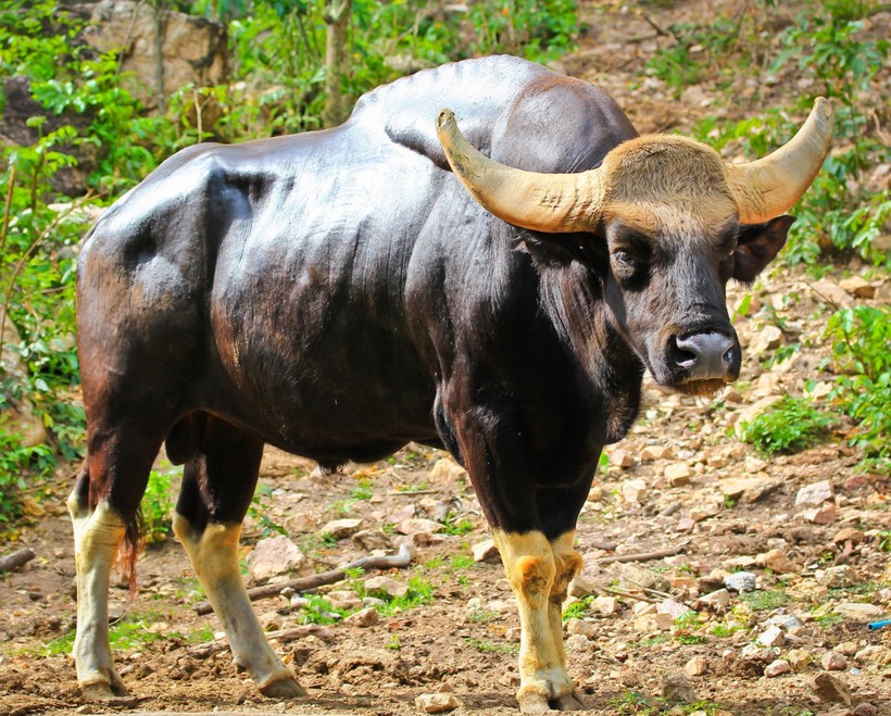 - Гаур — мощное млекопитающее, которого еще называют индийским бизоном. Имеет крупные загнутые рога и внушительное крепкое тело.