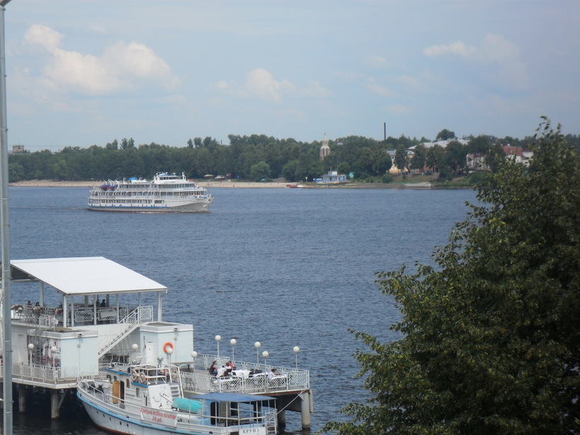 Волга в Ярославле большая, судоходная, много пассажирских круизных теплоходов и грузовых барж можно увидеть в порту и на реке.