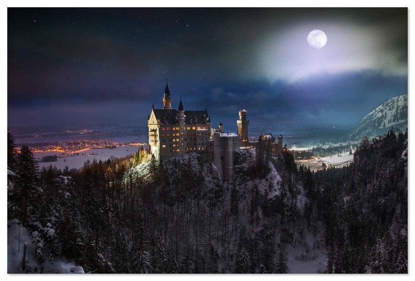 В Баварии, рядом с городком Фюссен, недалеко от границы с Австрией. Он стоит в окружении величественных Альп. Из окон открывается захватывающий вид на озеро Альпзее. Напротив замка расположено дикое ущелье Пёллата, через которое тем же Людвигом построен мост.