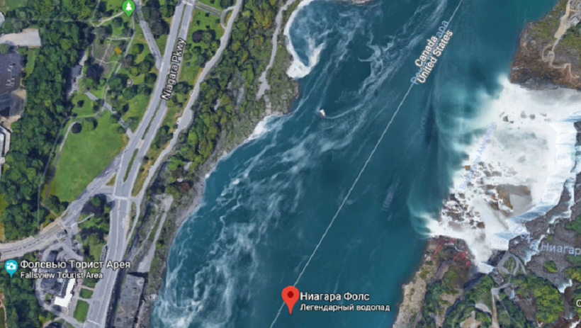 Водопад бушует на реке Ниагара, которая пересекает границу Канады (Онтарио) и Америки (Ниагара-Фолс).