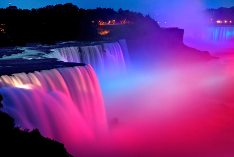 - В ночное время канадцы подсвечивают водопад разноцветными мощными прожекторами.